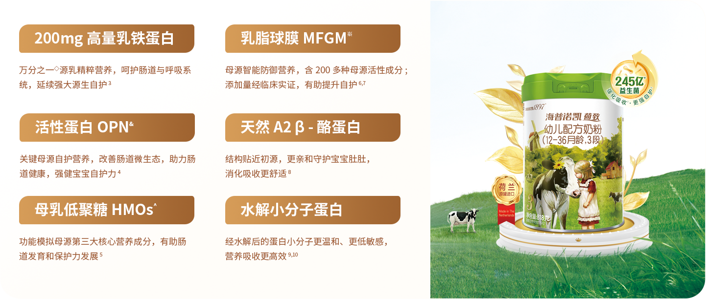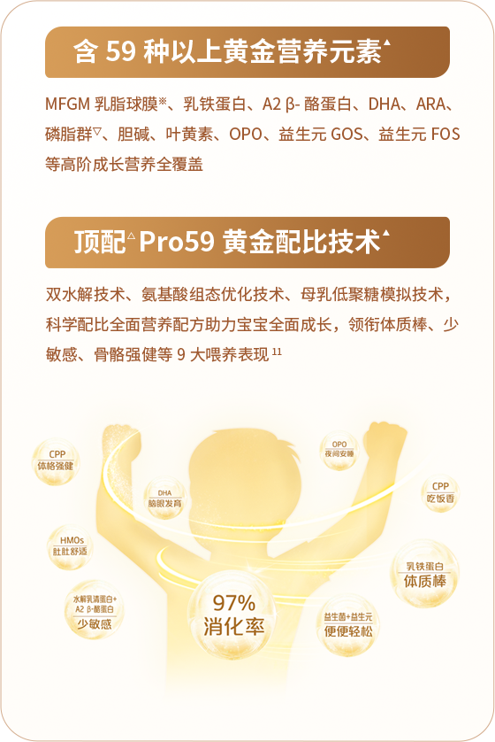 11.9大喂養(yǎng)表現(xiàn)指:97%消化率:指蛋白質(zhì)消化率,依據(jù)體外消化模擬實(shí)驗(yàn)及結(jié)果《強(qiáng)化OPO、LTF和CPP對(duì)嬰配粉蛋白和脂肪消化特性的影響》;肚肚舒適:HMOs促進(jìn)有益菌生長(zhǎng),增強(qiáng)腸道防護(hù),Carr, Loura E, et al. Frontiers in immunology vol. 12 604080. 12 Feb. 2021;體質(zhì)棒:乳鐵蛋白具有多重健康防護(hù)作用,乳鐵蛋白嬰幼兒健康效應(yīng)專家共識(shí)[J]. 臨床兒科雜志,2018, 36 (11):884-888;少敏感:水解乳清蛋白粉原料經(jīng)預(yù)消化,有助降低牛奶整蛋白致敏性;便便輕松:益生菌、益生元組合有助于嬰幼兒便便輕松。Vlieger AM, et al. Br J Nutr. 2009;102(6):869-75; Moro, et al. J Pediatr Gastroenterol Nutr, 2002;腦眼發(fā)育:DHA對(duì)嬰兒腦發(fā)育和視網(wǎng)膜發(fā)育至關(guān)重要,中國(guó)孕產(chǎn)婦及嬰幼兒補(bǔ)充DHA的專家共識(shí)[J]中國(guó)生育健康雜志,2015(2):99-101;吃飯香:CPP有助于提高鋅的吸收,鋅有助改善食欲,劉成龍,等. 現(xiàn)代食品29.23(2023):29-32.,2018.,GB28050;夜間安睡:OPO有助減少哭鬧,幫助夜間安睡,Ghide MK, et al. J Food Biochem. 2021 Jul;45(7):e13799;骨骼強(qiáng)?。篊PP有助于提高鈣的吸收,鈣有助骨骼健康,劉成龍,等. 現(xiàn)代食品29.23(2023):29-32.,2018.