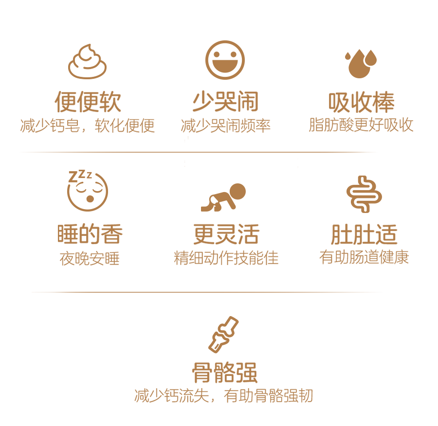 ~ 指產(chǎn)品中含有的小分子水解蛋白、a-乳白蛋白、益生元低聚半乳糖和低聚果糖、OPO等成分更親和胃腸道,有助減少消化吸收負(fù)擔(dān)。