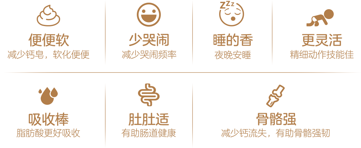 ~ 指產(chǎn)品中含有的小分子水解蛋白、a-乳白蛋白、益生元低聚半乳糖和低聚果糖、OPO等成分更親和胃腸道,有助減少消化吸收負(fù)擔(dān)。